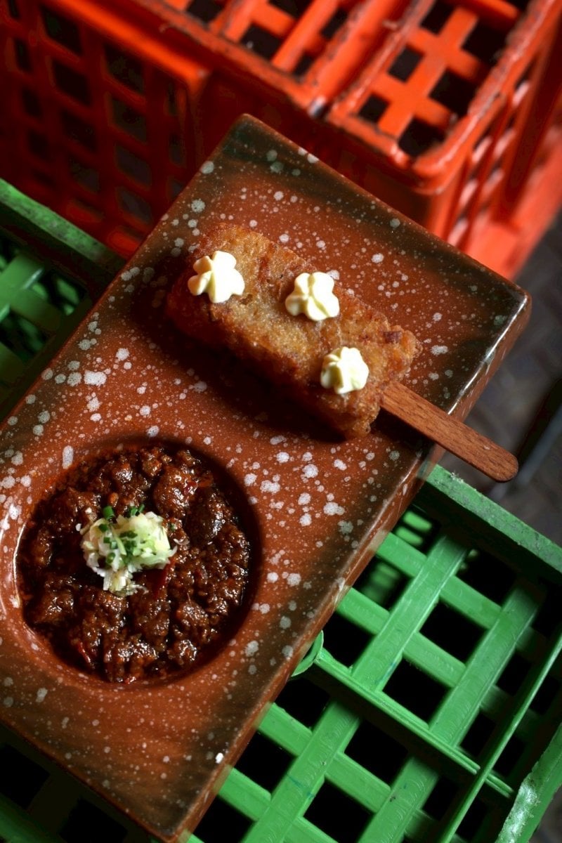另一道創意十足的「炸米糕冰棍」,靈感來自紅蟳米糕,把干貝、魷魚混進米糕內,做成可愛的冰棍造型,再搭配老抽花椒製作的麻婆醬,涮嘴到不行!