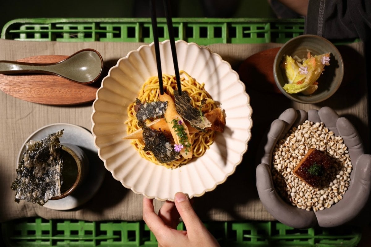 倉廩也貼心提供套餐選擇,只要點乾麵類加價130元,即可升級為套餐。主打新菜「蝦捲乾拌麵」以手作蝦捲為主角,搭配紅油撈汁與蝦油提味,越吃越夠味。升級套餐後,除了蝦捲乾拌麵,還附有單份的「山東蔥餅佐焦糖雞肝慕斯」、「上湯娃娃菜」和「鰹魚海菜湯」,一次滿足所有想吃的慾望,再也不用在菜單前猶豫不決。