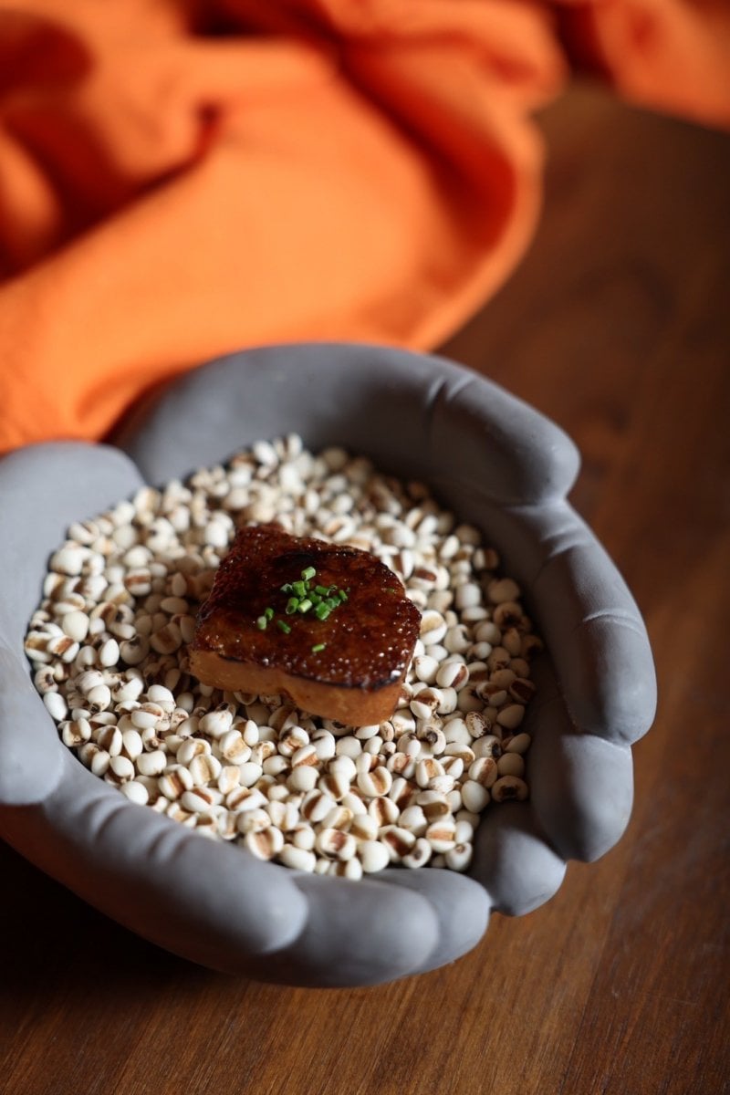 從小吃攤常見的山東蔥餅,搖身一變成為「山東蔥餅佐焦糖雞肝慕斯」,蔥香搭配炙燒過的雞肝慕斯,層次感超級豐富!