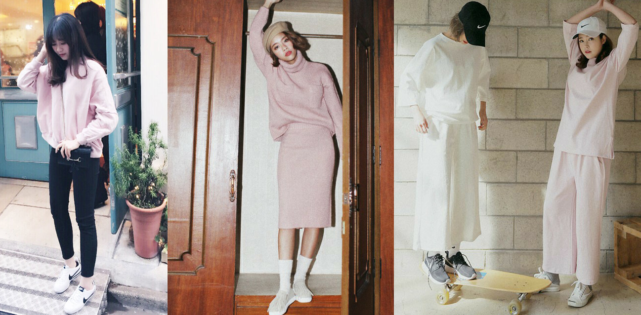 除了基本款的粉紅色大學T,今年還流行五分袖、太空棉、窄裙、寬褲等等單品,幾乎所有單品都有粉紅色。像中間的粉紅色look其實也不會太突兀,用白色、灰色這類比較中性的顏色平衡一下,穿出門也不會被人側目啦~