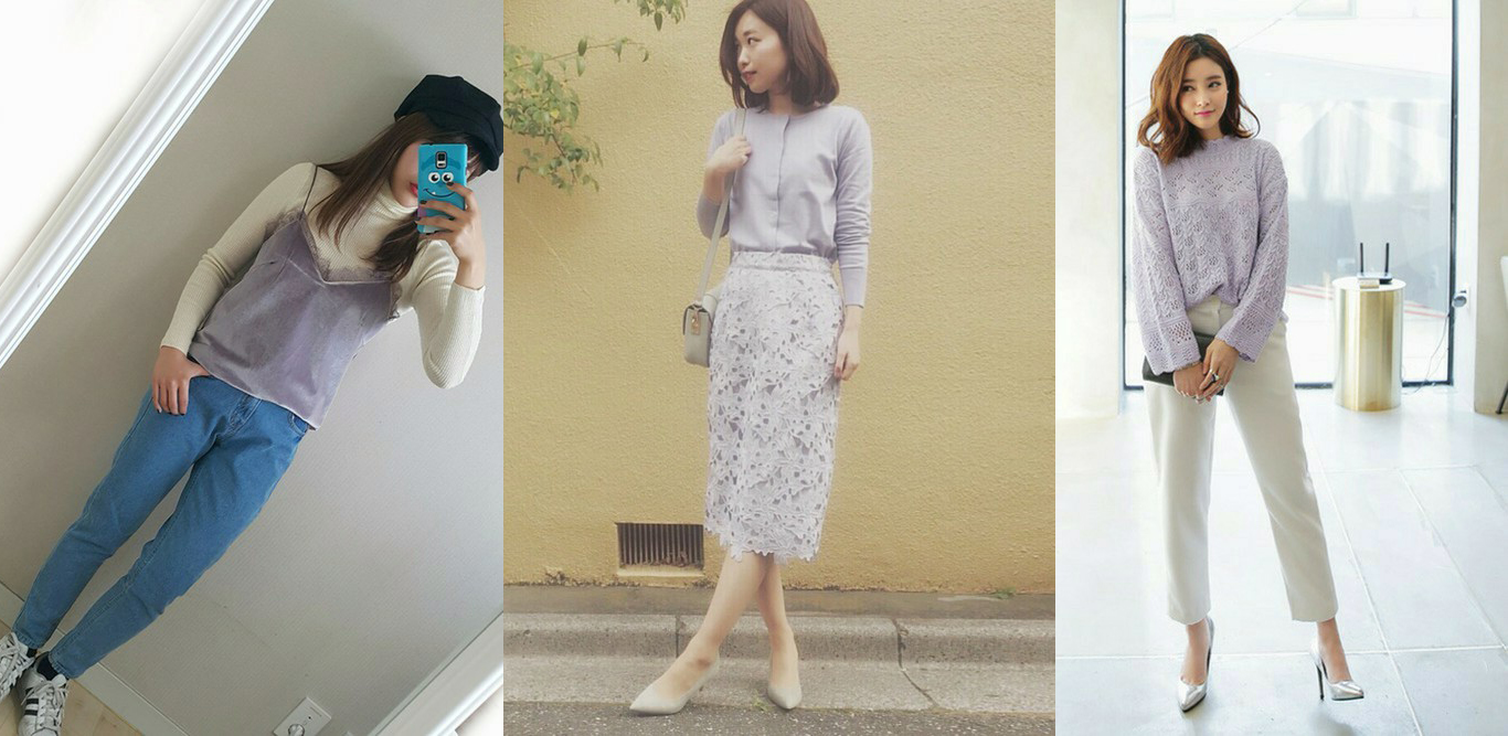 通常亮紫色的單品不是一般人的穿搭首選,但如果是粉紫色就不一樣了。而且它其實跟大部分的顏色都蠻搭的,像上圖的牛仔褲、白色直筒褲或是長裙,這些單品你的衣櫃裡也有喔。而最左邊的細肩帶上衣在韓國非常流行,幾乎每個女孩兒都有一件呢。