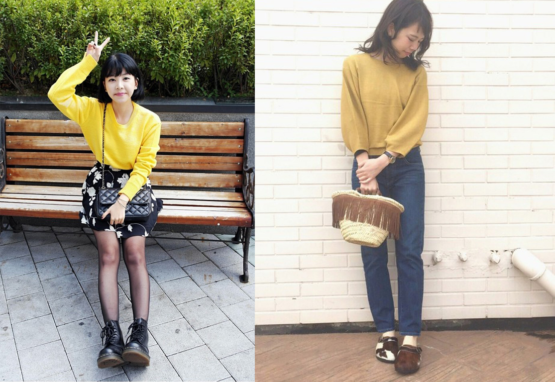 粉黃色也是能代表春天的顏色之一,搭配其他有碎花、條紋、點點花色的單品也意外地搭。不過黃色也是膨脹色之一,在穿的時候可以利用深色的單品來搭配,才不會看起來很胖喔。