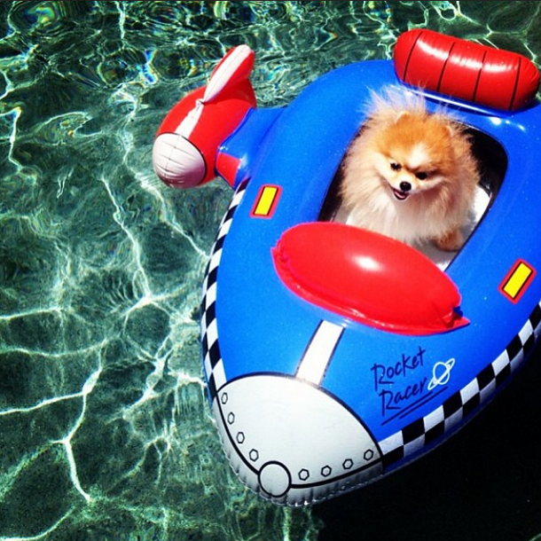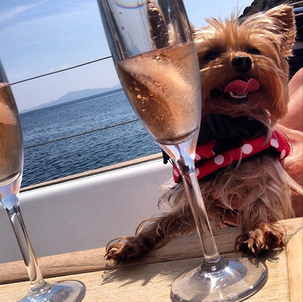 你可以看到猶如在度假的狗狗曬著日光浴,晶瑩剔透、清波蕩漾的泳池、香甜可口的香檳,外加上藍天白雲的好天氣,完全是人生勝利組!