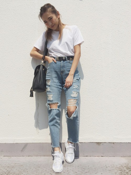 前面有提到白T搭牛仔褲很單調,不過熱愛牛仔褲的女孩也別氣餒,因為今年流行的褲款搭配白T超適合,像是日本女生最近都在穿的「鬚鬚長褲」,或受到歐美女生歡迎的「挖洞牛仔褲」,這些本身就非常有特色的褲款搭配簡約白T,造型感就能瞬間Up喔!