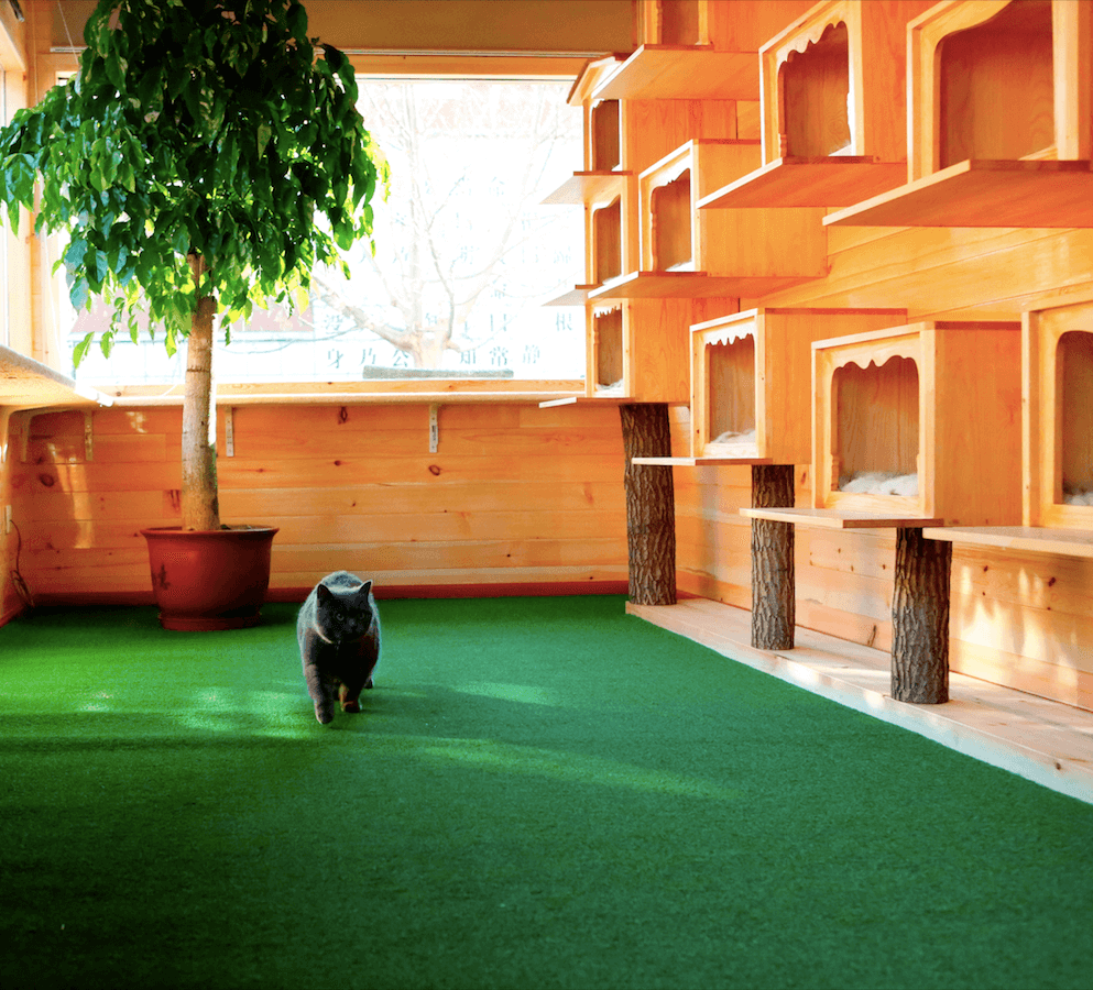 因為貓咪數量越來越多的關係,博物館內還特地隔了間貓咪宿舍!綠色的假草皮、樓梯,真是貓界的5星級飯店哪~