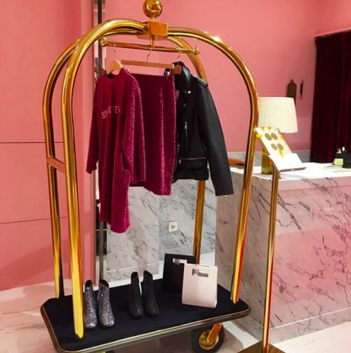 在STYLENANDA PINK HOTEL的Lobby也設有飯店的櫃檯,以白色大理石作為基底,再加上粉色系牆壁,兩者相間真的好比到了五星級高級飯店似的,而專業飯店才有的行李車也不可少,上面就放上了STYLENANDA當季推出的新品。(任妞挑選)