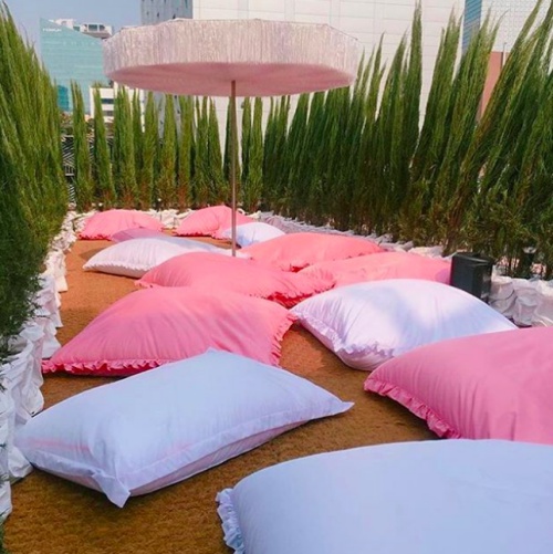 PINK POOL CAFE總共有兩區,分別是室內的游泳池休憩區,還有室外的好野人躺平區啊!粉色與白色的蓬鬆枕頭最適合躺著曬太陽睡一下,而到半夜這裡的夜景也是美到不行,要多愜意就有多愜意。(躺大字型)