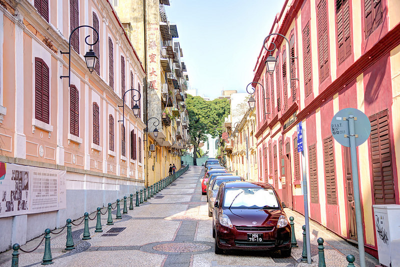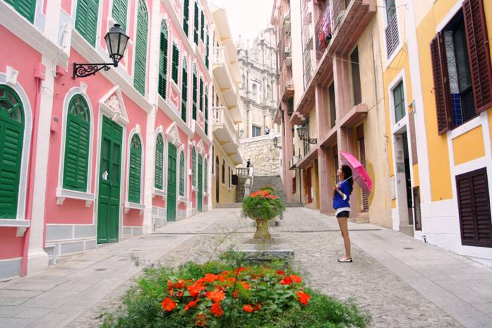 位於澳門最出名的古蹟大三巴牌坊旁,巷子中有一排建於19世紀的葡式樓房,粉紅色、鵝黃色的牆面,搭配白色邊框、綠色木製百葉窗,編織出有如愛情的夢幻感。