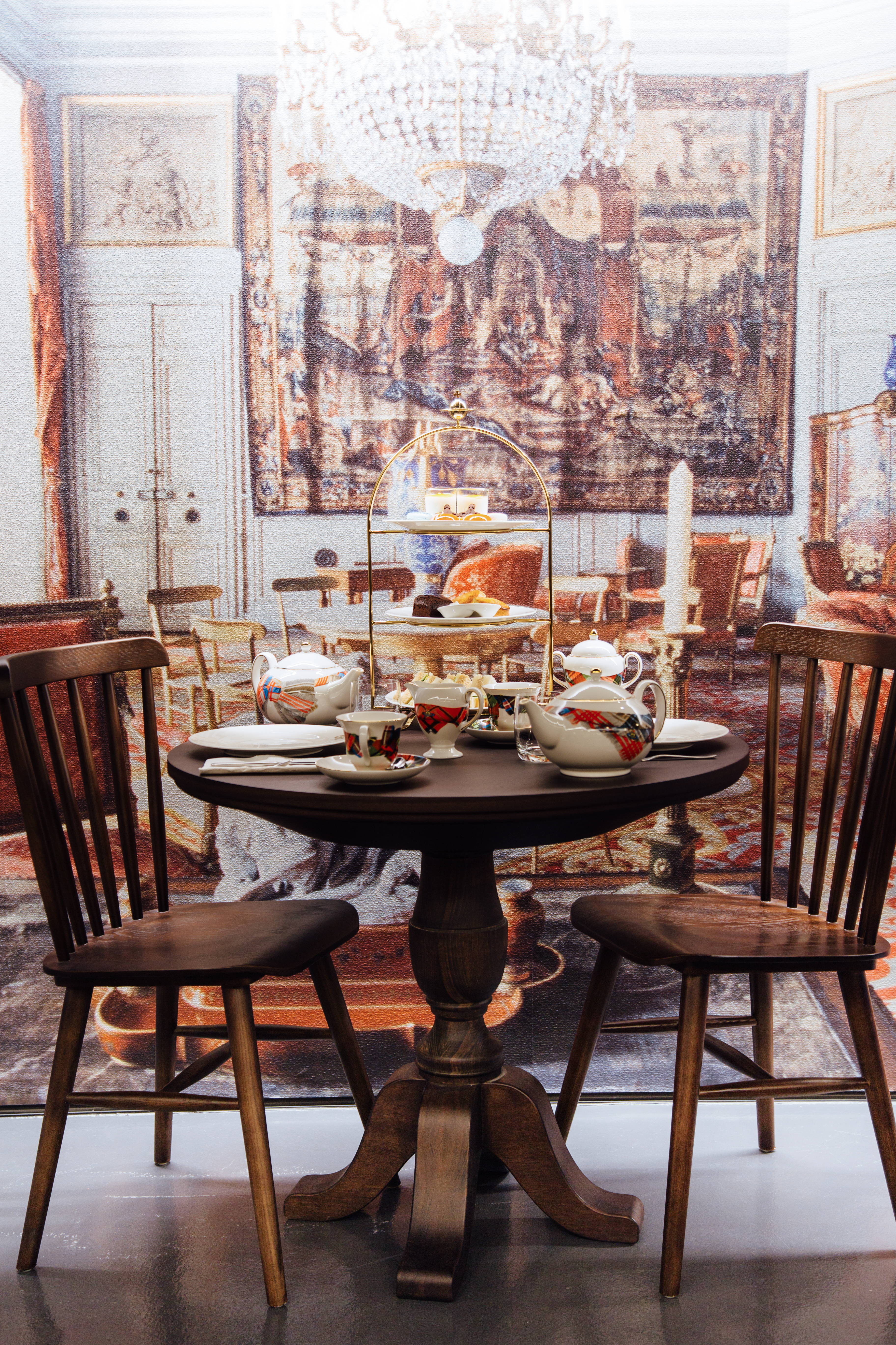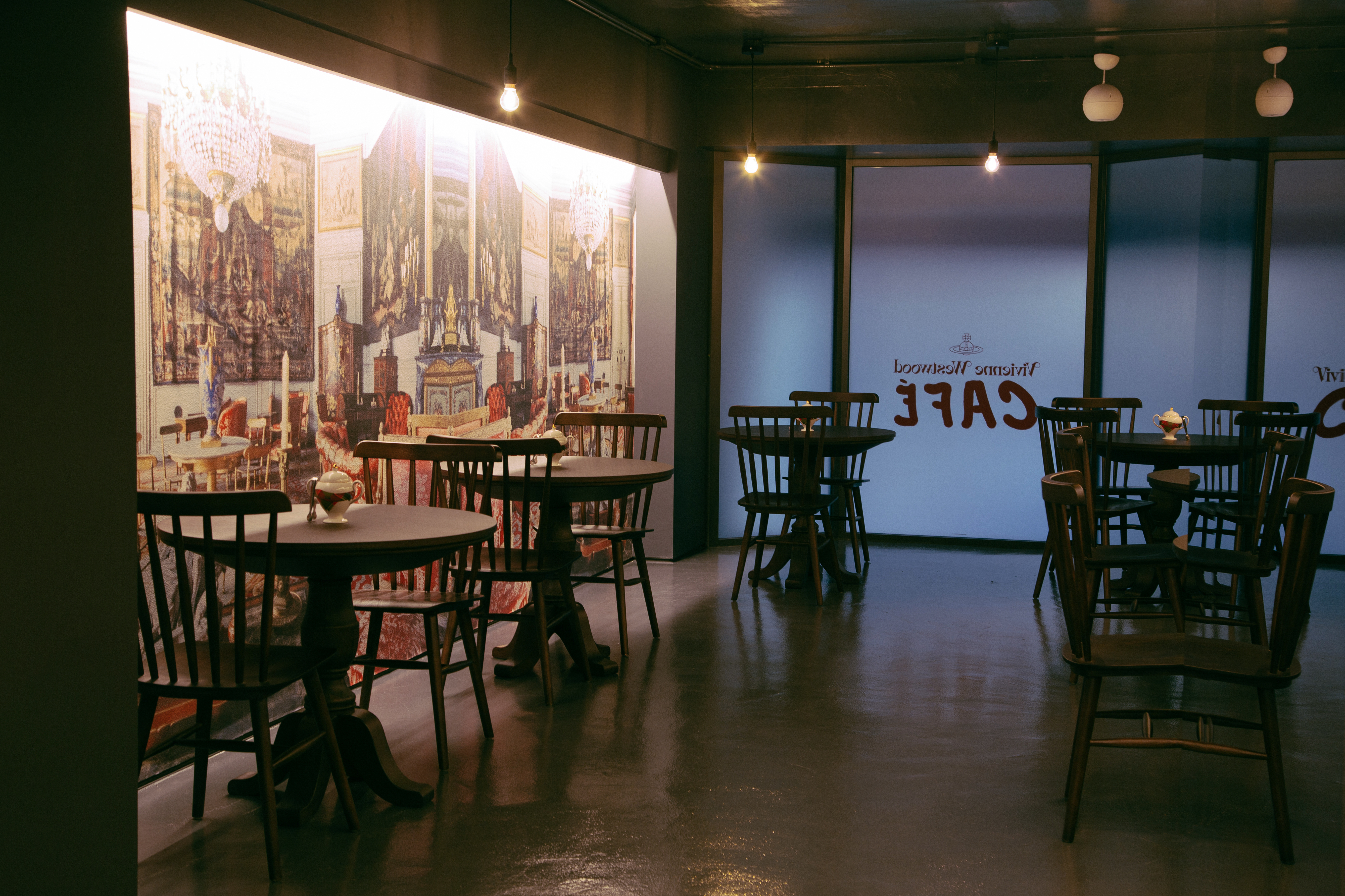 咖啡廳裡有一整面牆呈現華勒斯典藏館的巨型攝影輸出,華勒斯典藏館是設計師Vivienne在倫敦最喜愛的博物館,收藏17、18世紀的藝術作品和傢俱,也時常成為她的靈感來源;另一個區域則是呈現出一個小攝影棚的白色背板,巧妙表現出Vivienne Westwood秀場後台的一景。
