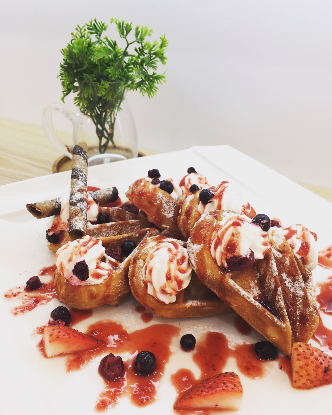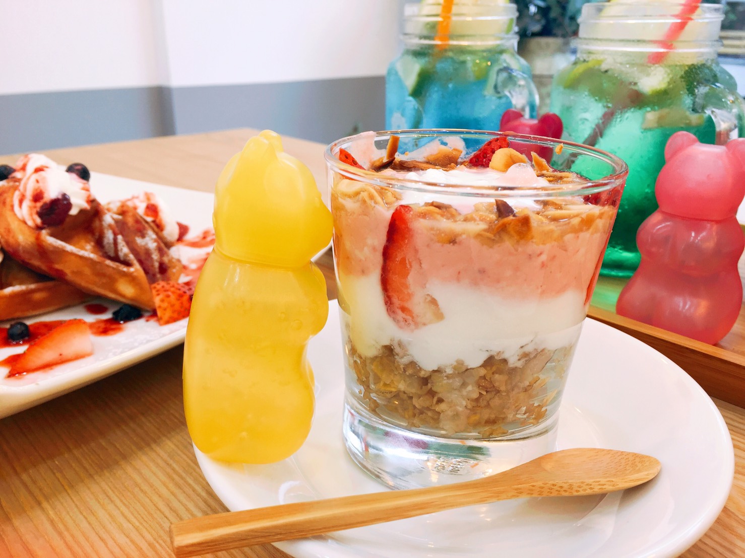 店中的人氣QQ鬆餅,淋上手打鮮奶油與新鮮水果、優格,熱量超低,吃起來有濃濃的蜂蜜香氣,深受女孩們喜愛。