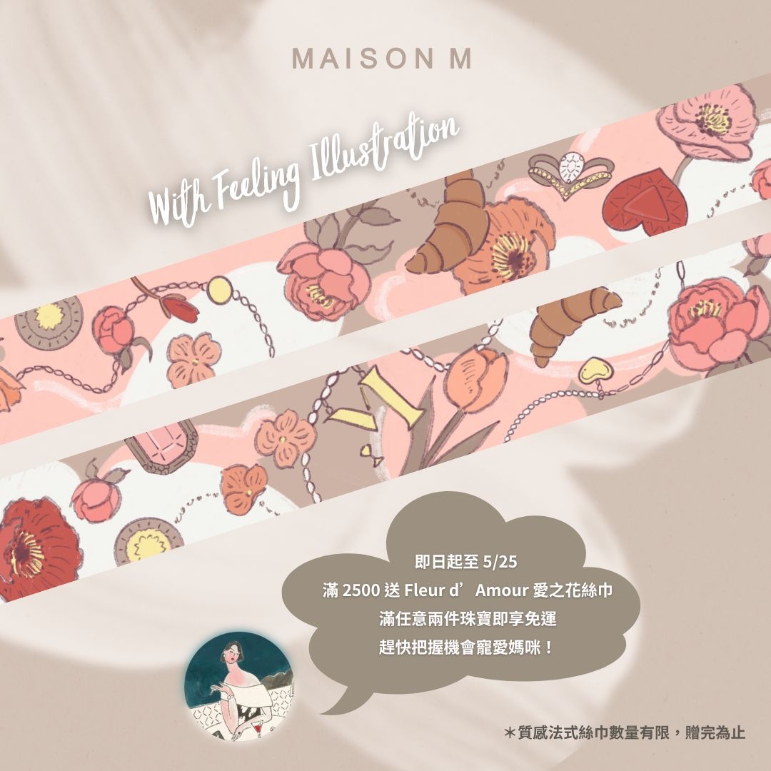 母愛如花,綻放於歲月之間。MAISON M 特邀法國超人氣插畫家 @feelingillustration 設計「Fleur d’Amour」愛之花絲巾,以法國母親節經典花卉——玫瑰、牡丹、鬱金香與小蒼蘭為靈感,象徵愛與感謝的綻放。絲巾雙面不同色調,既展現豐富層次,也如同母親與孩子的關係,無論哪一面,愛始終相依相伴。