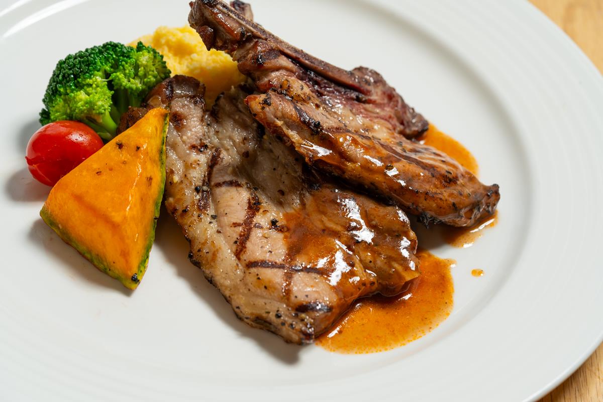 主廚許德正擁有25年餐飲經驗,深諳歐式料理精髓,並不斷鑽研中式與日式烹飪風格,擅長以創新手法結合多國料理元素,展現出風味獨具的餐飲作品。「香煎青魽魚佐白酒洋菇奶油醬」嚴選日本料理常用的青魽魚,肉質細嫩、油脂豐富,炙烤到外酥內嫩,搭配白酒洋菇奶油醬,融合洋蔥和蒜香,層次分明、入口難忘;「爐烤櫻桃鴨胸佐紅酒野莓醬」香料醃製24小時的櫻桃鴨胸,先煎後烤到七分熟,外皮酥脆、肉質鮮嫩,佐以酸甜紅酒野莓醬,香氣與口感兼具;「迷迭香紅酒燉羊膝」以迷迭香與紅酒醃製後慢燉的羊膝,肉質柔嫩入味,搭配番茄紅醬,口感濃郁卻不失清新。「碳烤豬戰斧佐玉米糕」戰斧豬排以迷迭香及橄欖油醃漬,再經過燉煮及碳烤,口感有紮實有嚼勁,搭配奶油玉米糕,風味獨特,令人齒頰留香;「慢烤手撕豬鮮蝦起司軟法堡附松露薯條」是專為親子客群設計的餐點,香脆的手撕豬肉、Q彈的鮮蝦與濃郁起司結合在酥軟法國麵包中,層次豐富,附松露薯條,香氣逼人,每一口都充滿驚喜。