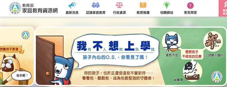 在教養這條路上,很多父母都走得跌跌撞撞,因為不知道自己做的到底正不正確,或是對孩子的成長行為有很多不知所措的時候。如果你也是其中之一,對許多門派、說法無所適從,不妨參考教育部的「家庭教育資源網」。