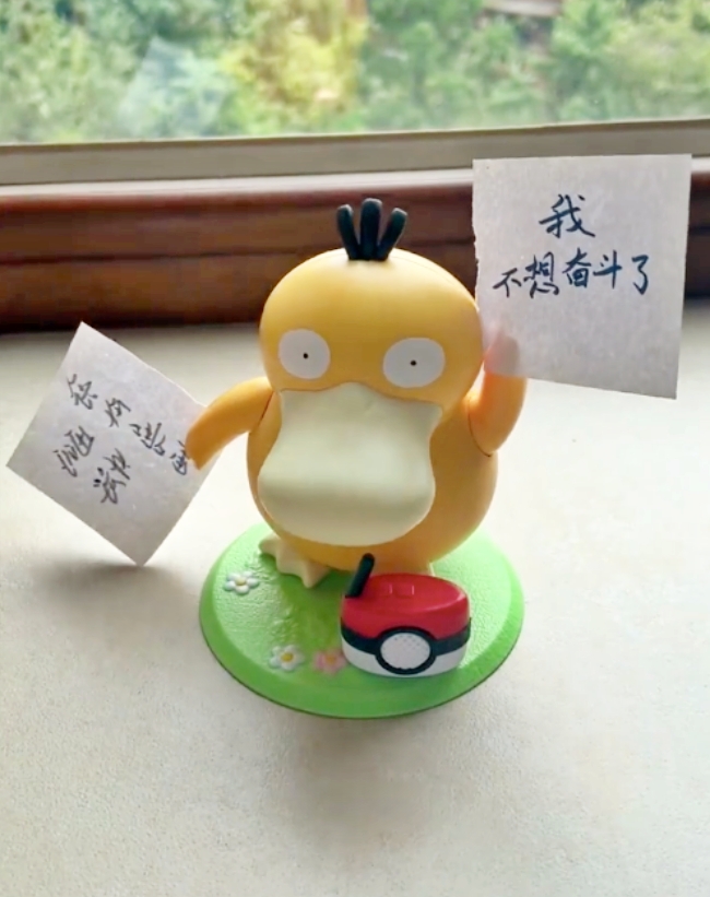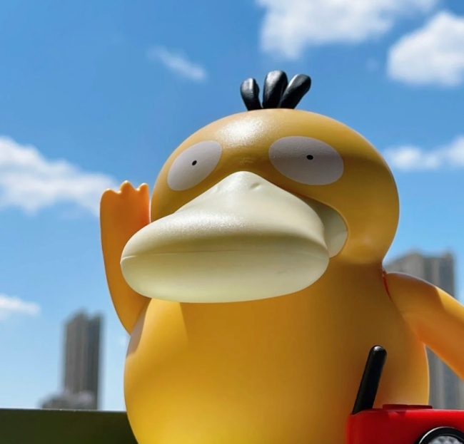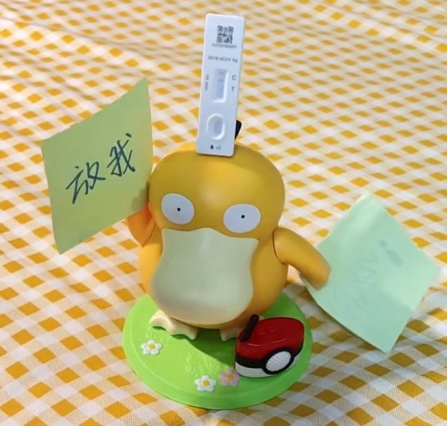 只要啟動可達鴨音樂盒,呆萌的可達鴨就會伴隨著魔性音樂緩緩起舞,而它的舞姿也相當特別,「左右旋轉+揮舞雙手」就像在跳廣場舞一樣,讓人忍俊不禁!看著可達鴨高舉手手的姿勢,網友們靈機一動,紛紛發揮創意為它貼上寫有文字的便條紙、快篩試劑等等,可達鴨一秒化身迷因鴨鴨!