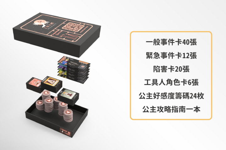 在內容物的部分,一共有六類物件。分別是:一般事件卡、緊急事件卡、陷害卡、工具人角色卡、公主好感度籌碼、公主攻略指南。