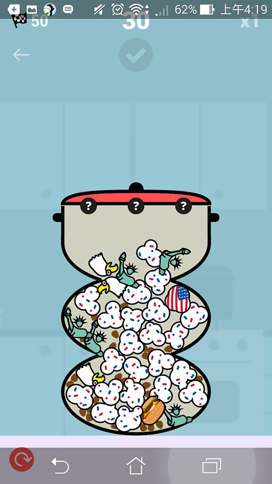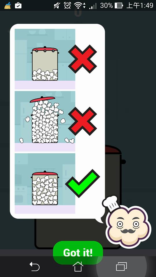 控制玉米粒多寡由手指接觸螢幕的時間計算。標準就是爆米花要爆好爆滿,太多或太少都是不行滴~