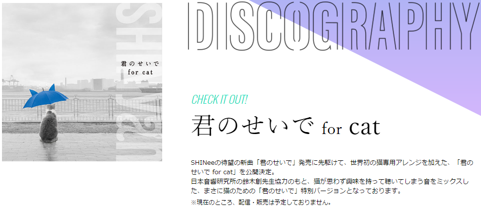 是的!其實這都是SHINee預計將在5月18日於日本販售的新單曲〈君のせいで〉做的宣傳廣告啦!根據SM經紀公司日本支社的說法,5隻貓咪為了展現出最佳的舞台,每天很認真的練習呢!可以期待5月18日有完整版〈君のせいで for cat〉MV公開嗎?(笑)