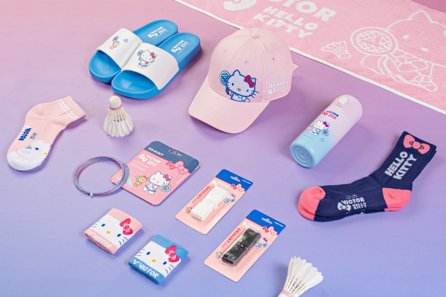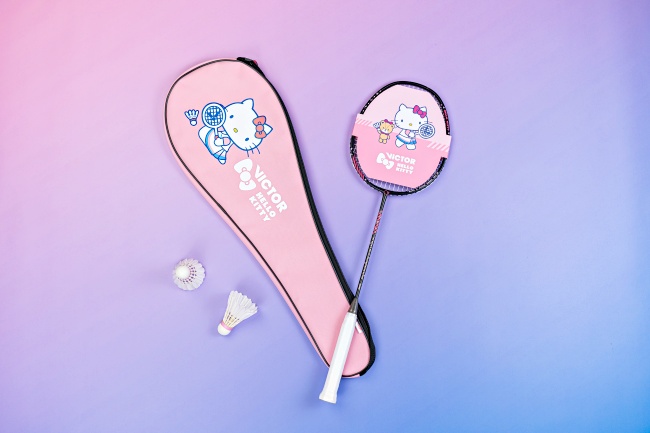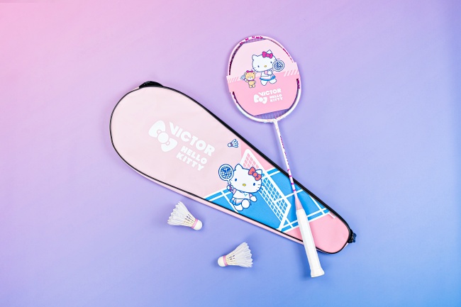 VICTOR X HELLO KITTY 聯名羽球拍 進攻NT.5500/聯名羽球拍 全面 NT.3600/聯名羽球拍 速度 NT.1250/聯名拖鞋NT.1200/聯名運動女襪 NT.250/聯名浴巾NT.750/聯名運動帽NT.600/聯名護腕NT.400