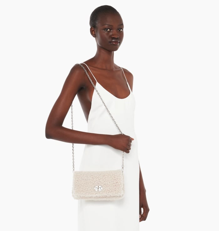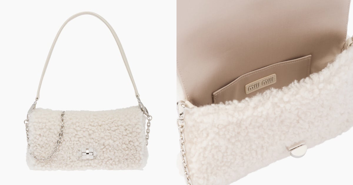 浪漫又摩登的MIU MIU在前幾季以Y2K迷你裙跟短上衣打造的露肚裝造型受到大量關注,再度展現了品牌的魅力,在今年秋冬也推出了以柔軟羊絨皮打造的包款,這款小包包身式柔軟雪白的羊毛設計,搭配上皮革短背帶,可以手提也適合作為腋下包,另外還有一條鏈條肩帶,可以更換作為斜背使用。