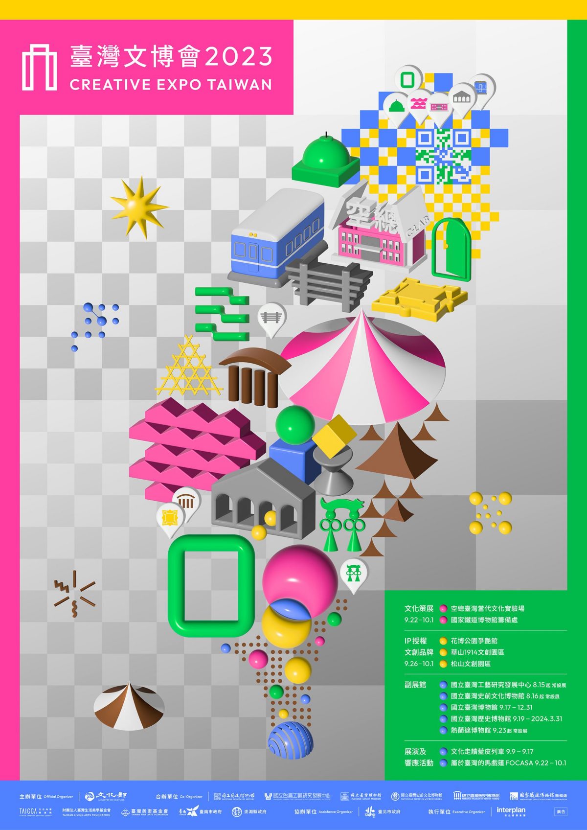 整體視覺以繽紛的用色與立體圖樣吸引目光,包含熱情活躍的紅色代表文化策展、綠色象徵IP授權的生機與創新、文創品牌的明亮靈動設定為黃色、藍色象徵各地副展館沈穩深遠的意涵、輔色的棕色展現深厚文化底蘊、銀灰色則是對科技與當代藝術的重視。