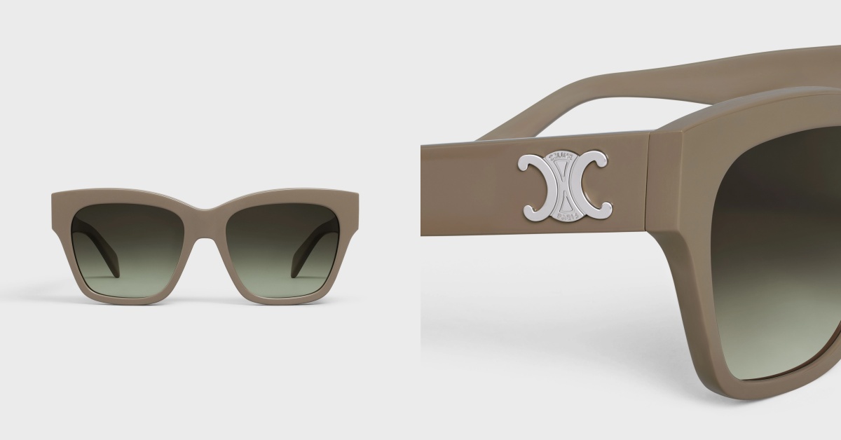 CELINE的墨鏡款式簡約卻帶有變化,這款醋酸纖維TRIOMPHE 09太陽眼鏡奶茶色的框身搭配TRIOMPHE標誌溫柔又知性,採用貓眼形狀的鏡框配戴時可以修飾臉型,漸變色的鏡片搭配時也更日常休閒!