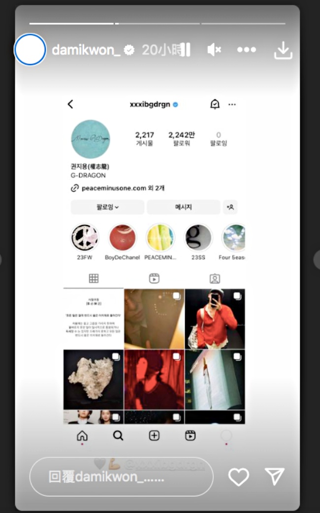GD的親姐姐「權達美(권다미)」也看不下去,在事件爆發時就曾多次發文力挺弟弟,還直接在個人IG怒轟:「瘋了!是在寫小說呢!」近日真相水落石出,透過檢測還了GD清白,權達美也限時動態上傳真實心境,不只截圖弟弟帳號頁面以「打氣」的表情符號為他開心應援,同時也狂轉新聞暗酸韓國警方…