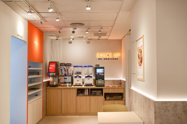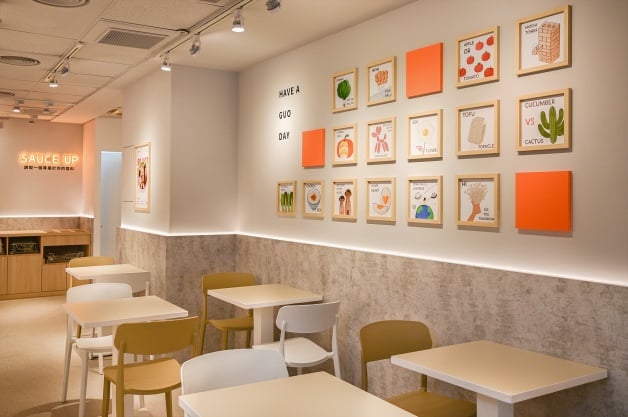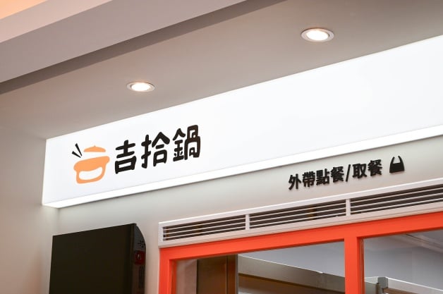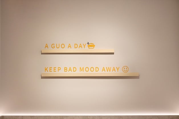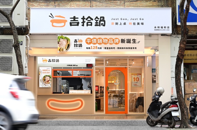 吉拾鍋總坪數26坪,約有26個座席,整體以「明亮橘」為主色調,設計中加入打卡牆面,像是寫著「Just Guo」、「Have A Guo Day」、「A Guo A Day Keep Bad Mood Away」等,而且相框主題區還隱藏小巧思,像是明天見的金針菇、化身狗狗的鑫鑫腸等!(笑)