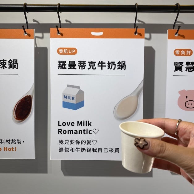 吉拾鍋店內設有「先試湯頭,吉運當頭」的特色服務,每日提供三種湯頭供選擇障礙的妞妞們試喝,像是「So Hot麻辣鍋」、「羅曼蒂克牛奶鍋」和「賢慧系豚骨鍋」等,不僅增添鍋物用餐的趣味性和選擇性,大家也可以找到自己的命定鍋!