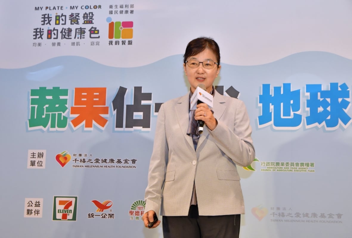 國民健康署吳昭軍署長表示,國健署除了持續推動「我的餐盤」,鼓勵國人在生活中落實均衡飲食,今年也跟上全球蔬食風潮推出升級版「植物為主飲食手冊及懶人包」教民眾吃得健康又減碳,因此非常認同千禧之愛此次推動的「蔬果佔一半 地球更友善」運動!行政院農業委員會農糧署胡忠一署長也表示台灣四季都有時令的優質蔬果,必能配合「蔬果佔一半 地球更友善」吃出豐富、美味、當令在地的植物食材,不但能幫助國人健康遠離疾病,同時縮短運送里程還能降低運輸碳排放及食物儲藏的能源。而為號召更多注重健康、地球永續、體內環保的年輕族群加入,千禧之愛健康基金會也特別邀請素有國民老婆之稱的泱泱擔任活動推廣大使。泱泱一上台便首度公開「專屬餐盤-蔬果纖美餐」,內有活力彩蔬沙拉、雞肉紅藜麥飯糰及香蕉,大方分享如何輕鬆簡單達到蔬果佔一半的目標。泱泱說因為工作忙碌,無法自己準備餐點,工作需求又得保持纖瘦健康,所以知道這飲食法可符合需求後,撇步就是每餐最少吃兩種以上的蔬菜,出外景時就直接去超商買沙拉跟水果來吃。購買時會特別閱讀後面的營養標示,確認熱量及各項營養素含量。最後泱泱也呼籲大家快來參加基金會「蔬果佔一半,地球更友善」網路活動,加入植物蔬食愛地球行列,還可以得到優惠券,一舉數得!