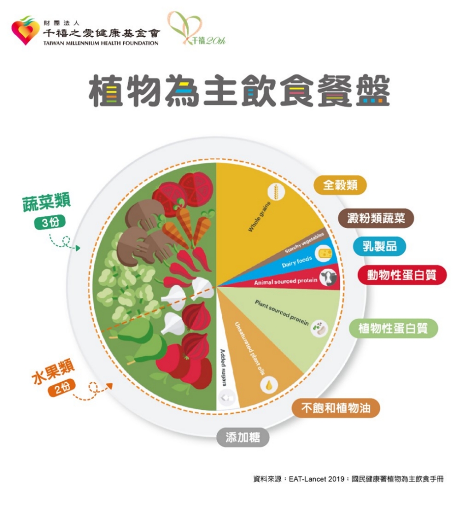 千禧之愛健康基金會董事長,同時也是國家衛生研究院副院長許惠恒表示,基金會倡議這簡易健康低碳飲食法是根據以地球健康為旨的全球性營養組織EAT Lancet委員會所提出的「植物為主飲食」“Plant-Based Diet”,主要著眼於106 -109年國民營養健康變遷調查顯示(註1)國人在攝取蔬菜水果都嚴重不足,蔬菜類-19歲以上79.9%未達3份;水果類-19歲以上87.6%未達2份,幾乎是人人蔬果都吃不夠,會間接影響台灣癌症或慢性病的預防。另一方面,地球暖化嚴重,在各單位與企業投入減碳大作戰的同時,其實最簡單就是每個人一周一次改吃植物蔬食,即可幫助降低碳排放為地球降溫,同時穩定地球糧食供應。怎麼做呢?許董事長表示很簡單,就根據口號把自己的餐盤(盒)畫一半,用蔬、果3:2比例填滿就是了,另一半再裝主食及蛋白質,但最好也是選擇植物來源。