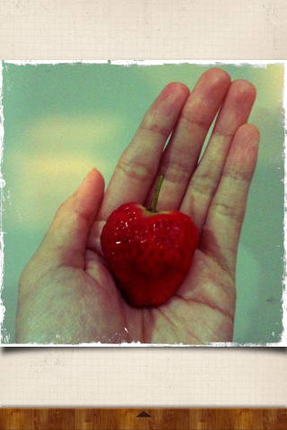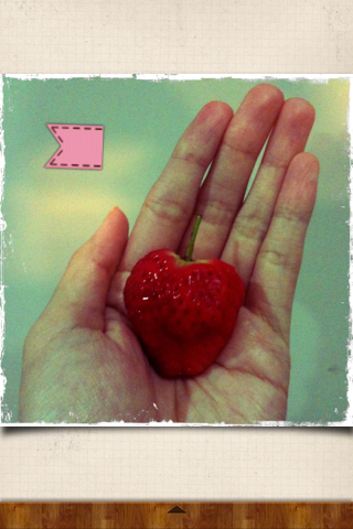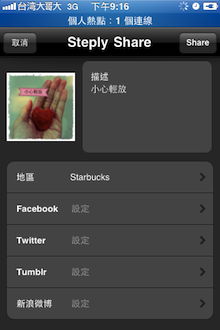 上下箭頭的功能很直觀:↓代表下載儲存至相簿中,照片大小和原本一模一樣,只是上頭多了幾張可愛的標籤;↑就是上傳分享囉!可輸入一段文字敘述、在地圖上標記你的所在位置,並設定上傳到Facebook、Twitter、Tumblr和新浪微博。