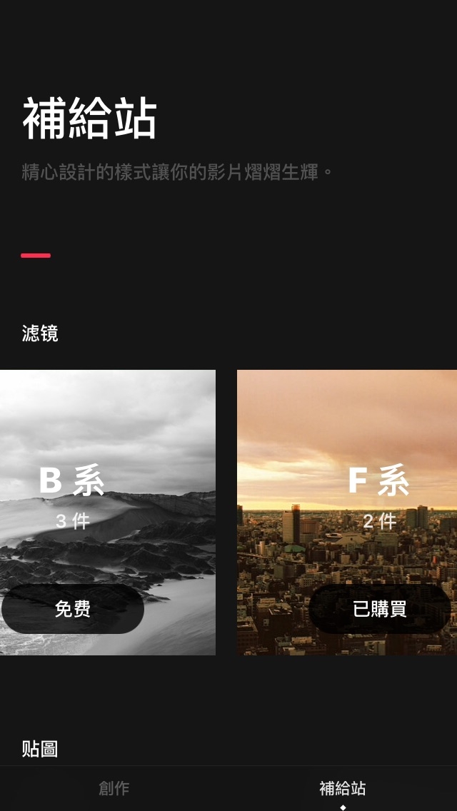 如果覺得官方一開始內建的濾鏡不夠多,可以到「補給站」中逛逛,這裡不定時都會推出免費的新濾鏡供使用者下載喔!