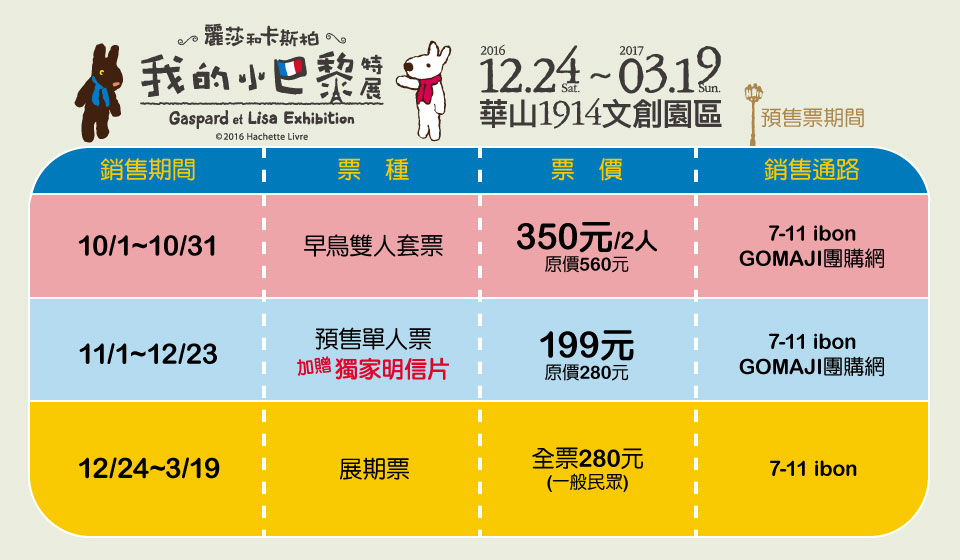 今年聖誕節,麗莎和卡斯柏遠從法國巴黎跨海來台,要跟台灣的粉絲交朋友囉!在《麗莎和卡斯柏 我的小巴黎特展》中,可愛到不行的兩位化身超級導覽員,帶領台灣觀眾飛越9855公里來到法國巴黎!從凱旋門出發,一路到宏偉的羅浮宮賞畫;在百年莎士比亞書局體驗書香、悠閒的塞納河畔享受午茶時光、時尚殿堂香榭大道盡情血拚,最後抵達浪漫的艾菲爾鐵塔一覽法式夜景風情!