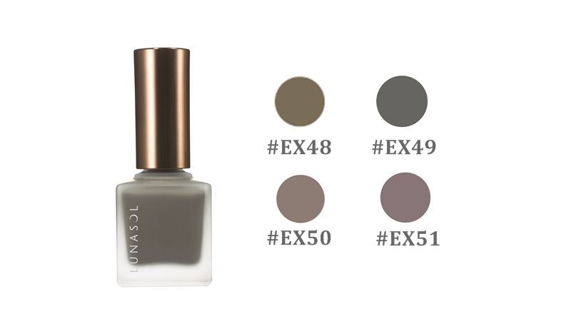 羽薰淨化系列晶巧指甲油/NT$520/共4色:#EX48 Foggy Khaki、#EX49 Foggy Gray、#EX50 Foggy Beige、#EX51 Foggy Mauve