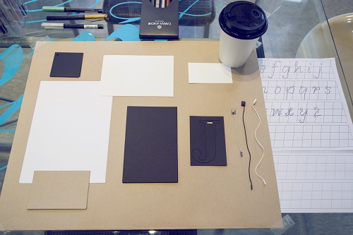 剛進到工作室時,就看見桌上擺滿了各種紙張和筆類,老師會先簡單講解一下各種書寫的工具,大致上分為平頭筆、軟筆刷、沾水筆等等不同種類,學習順序沒有一定,但建議從軟筆刷開始。