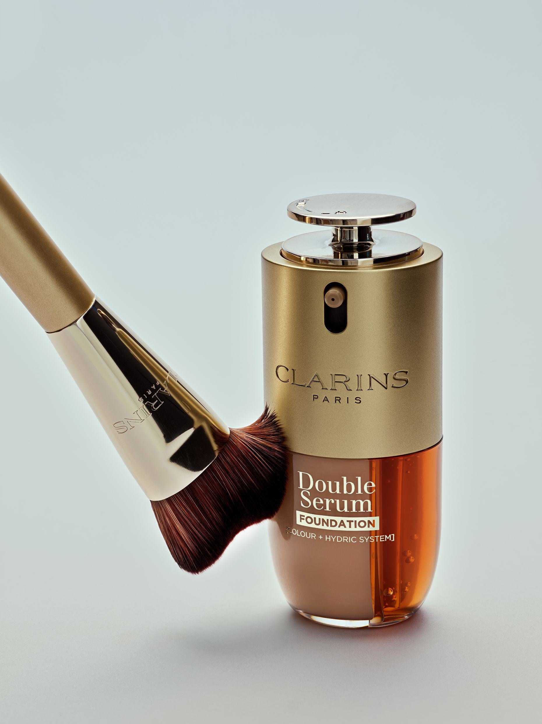 為將「黃金雙萃精華粉底液」的頂級抗老養護與彩妝表現推向極致,克蘭詩科研團隊與全球彩妝創意總監 Marie Duhart 共同創作出以刮痧小臉為靈感,上妝同時按摩的拉提粉底刷。刷頭特殊曲線與粗細不同的刷毛,能完美貼合臉部輪廓曲線,將粉底液均勻推展,並在上妝同時提供促進臉部微循環,打造自然塑形的精緻妝容。