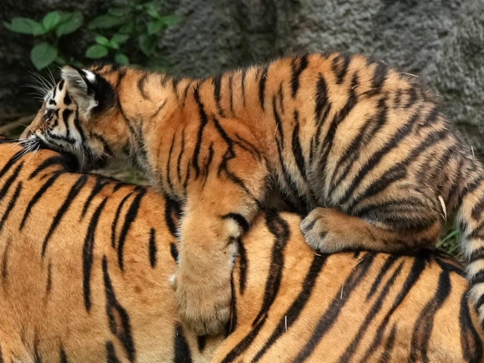 除了嬌羞的照片之外,他還捕捉許多有趣的畫面,像是頑皮的小老虎互相打架,而媽媽在旁邊淡定看著牠們的模樣,彷彿已經看淡「虎生百態」,不管小孩做出什麼驚天駭人的事,牠感覺也不以為意~(笑)所以感到無聊的小老虎只好自己去追追蝴蝶、玩玩石頭自得其樂了!(故事是這樣接的嗎?)