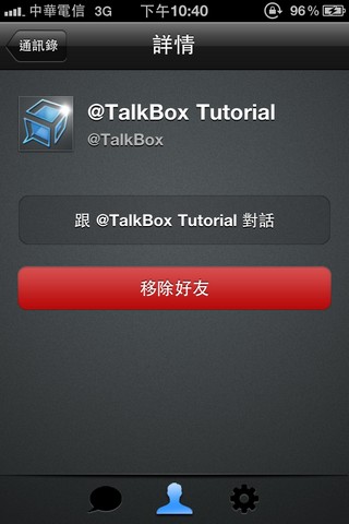 TalkBox有內建的導覽機器人,不用怕測試的過程中叨擾到朋友,只要從通訊錄中點選一個人選,按下中間的按鈕「跟@XXXXX對話」...