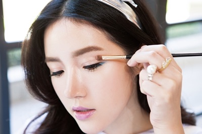 運用深淺色珠光堆疊幫輕淡的眼妝加分,淺色珠光在眼中加強,妝感更立體。