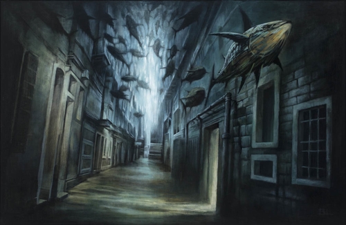 因此Brin Levinson將野生動物們也畫進了這些家鄉的圖像裡,以一種看似超現實的手法描繪這些實際發生在我們生活當中的景象,來告訴人們環境的脆弱與珍貴,若是我們不好好珍惜,最終就會失去一切。
