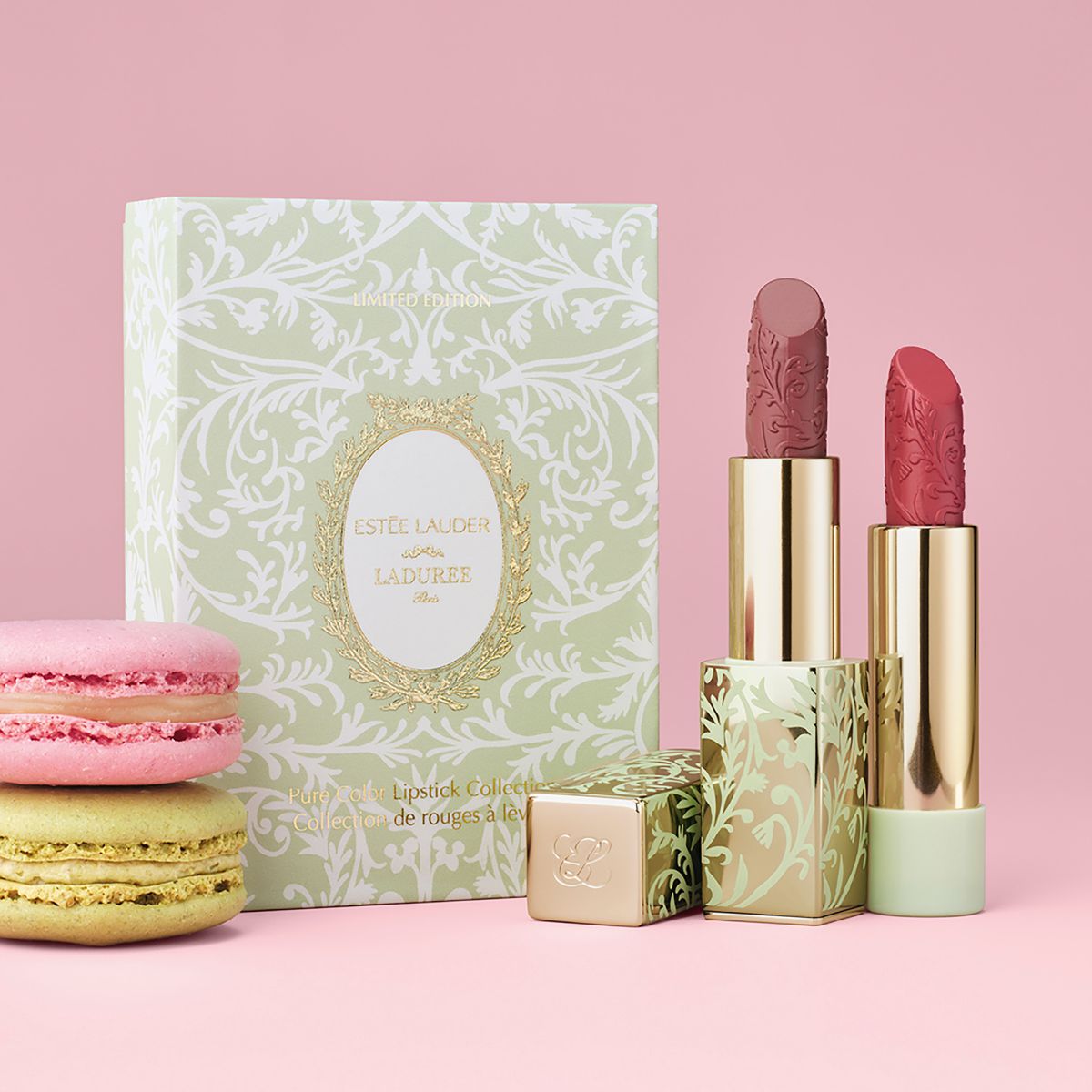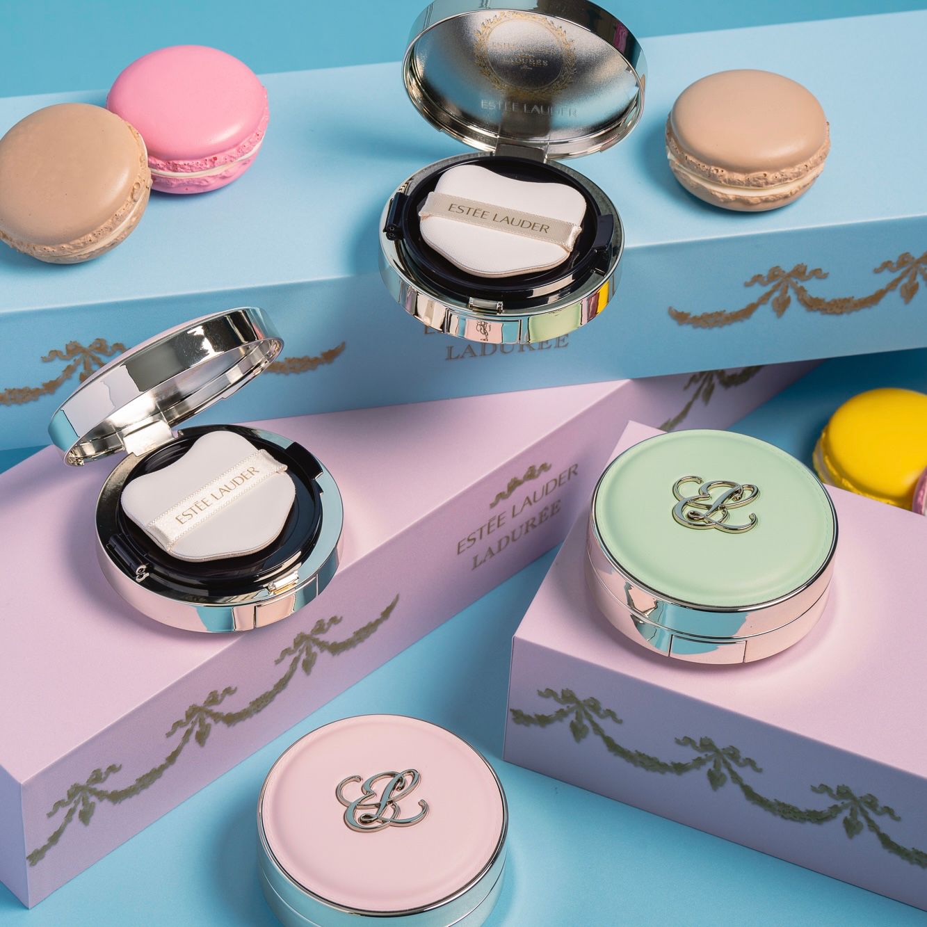 雅詩蘭黛今年情人節放大絕招,首度攜手法國百年精品馬卡龍品牌Ladurée合作,精選明星熱賣彩妝,包含粉持久天生美肌氣墊粉餅、絕美奢潤精萃唇膏,換上夢幻馬卡龍色系包裝,更以馬卡龍甜點口味為靈感,打造絕對慾望訂製8色眼彩盤 Ladurée聯名款。