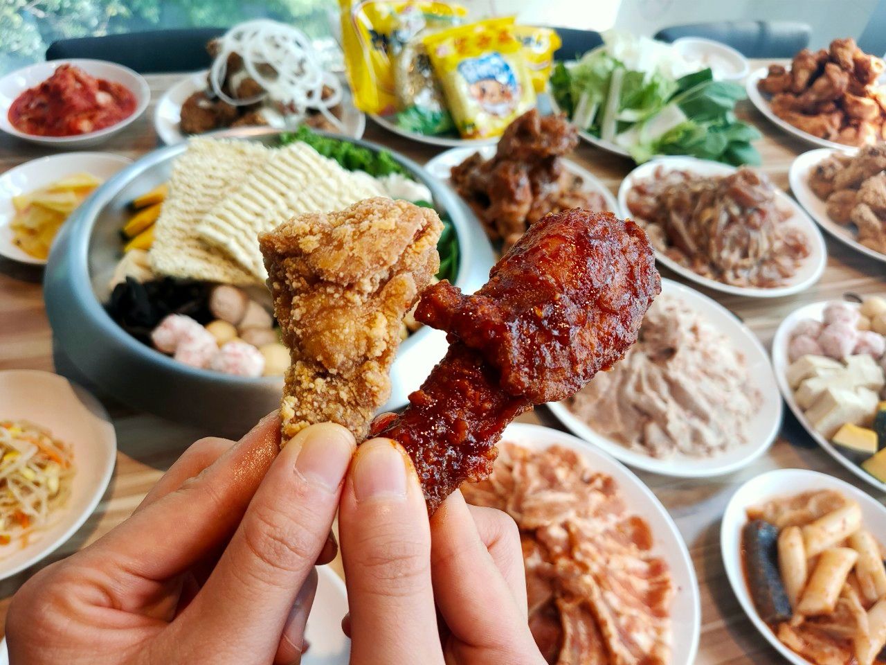 為了滿足不同的饕客,銅盤分成兩種不同的吃到飽方案!首先是「火鍋、炸雞雙饗」,只要329元即可無限量狂吃6種口味韓式炸雞以及經典火鍋,吧檯上的新鮮蔬菜、火鍋料和韓式小菜,通通無限量供應,想吃甚麼自己夾!妞編輯更推薦大家迷戀泡菜鍋的朋友,也可以將泡菜大把地放入,為湯頭增加酸辣口感,最後再放上泡麵,就成了豐盛又美味的韓式泡菜鍋啦。