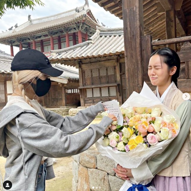 不只有應援餐車到場,Rosé本人居然全副武裝悄悄出現在拍攝現場啦!帶著黑帽、黑口罩變身「驚喜外送員」,為惠利獻上超大束的鮮花,原來6月9日是惠利27歲的生日,繼在「認哥」爆料Rosé曾為了送生日花朵到惠利家,IG私訊惠利親妹詢問住家住址後,這次終於可以本人出馬獻花(笑),惠利立刻感動噴淚表示:「拿著大束鮮花、唱著生日歌過來的你,怎麼能不喜歡你這孩子嗚嗚~」(太美好的友情)