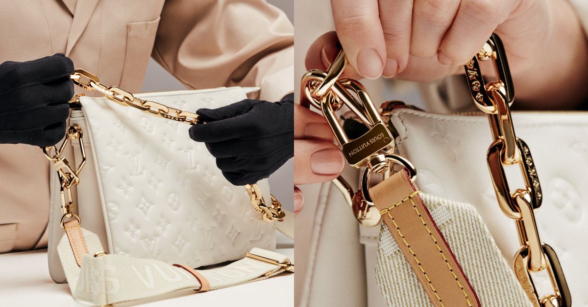 「COUSSIN」枕頭包外型簡約俐落,細節更是萬分迷人,為了讓皮革展現柔軟蓬鬆的效果,使用軟嫩的小羊皮打造,穿搭感與手感都超好,同時因為主打多Way背法,所以每款包都搭配了一條粗織帶的背帶以及粗金屬鍊帶,在金屬鍊帶上也具備了LV經典的Monogram老花圖案與品牌Logo。