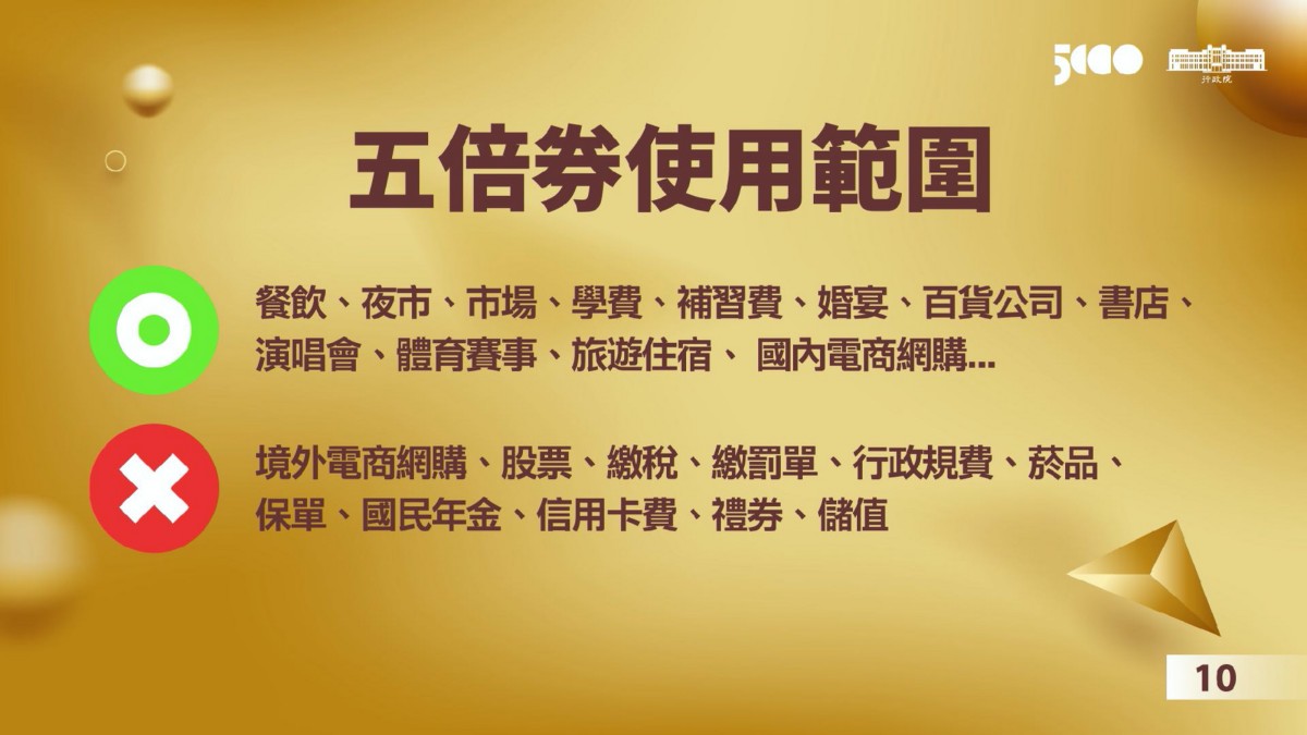 這一次的紓困方案,目的一樣是要刺激台灣人在國內的觀光消費,五倍券的適用範圍,在餐飲、夜市、市場都可以用,也可以繳學費、補習費,百貨公司、書店、演唱會、體育賽事、旅遊住宿、國內電商網購都能用!