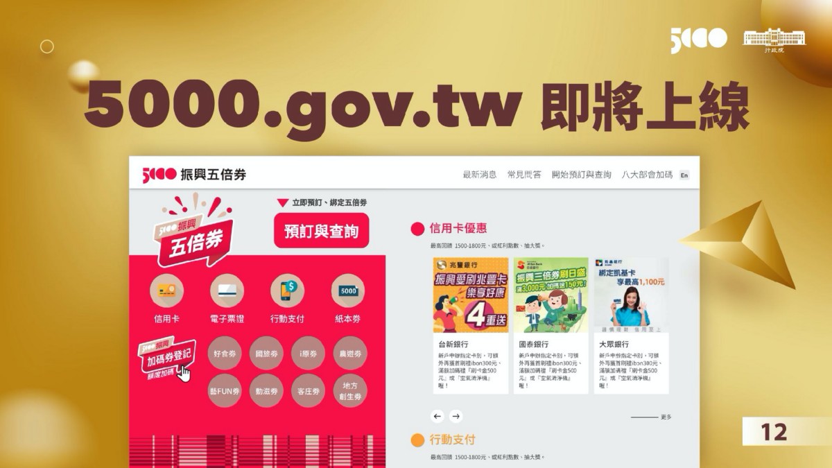 至於信用卡、行動支付、電子票證,就可以透過五倍券官網、數位支付業者的網頁或App預約,之前模式會是「刷5000元、僅出帳1000元」方式,這一次將會直接為你下期卡費減5000元(前提是要先刷超過5000啦),而電子票證一樣是「上網登記靠卡回存」。而且數位券今年可以手機共同綁定,也就是去年一人手機只能綁自己,今年一人就能綁全戶券。