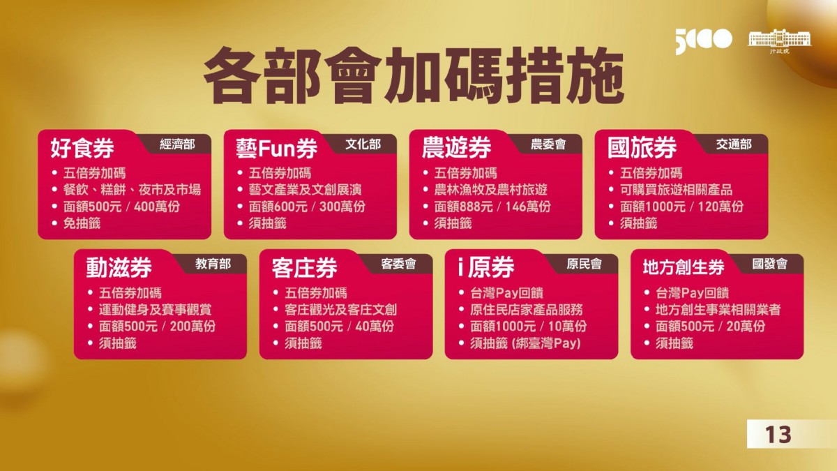 這一次的加碼券包括:可向旅行社購買團體旅遊行程、飯店住宿、遊樂園區門票的1000元「國旅券」、可用於夜市、市場、糕餅店家及餐飲場所的500元「好食券」、適用於地方創生相關審查補助計畫及其合作網絡的「地方創生券」、可至原民會認證店家消費的「i原券」,另外大家熟悉的888元「農遊券」、600元「藝FUN券」、500元「客庄券」和「動滋券」通通都回來啦!