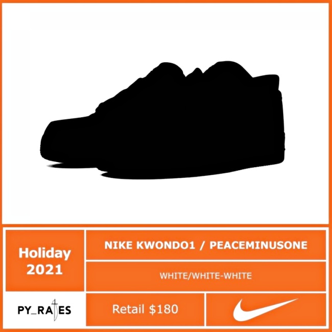 PEACEMINUSONE官方IG緊接著曬出高清實品照,果然是以白色為主色,新鞋型命名為「KIIIONDO 1(퀀도1)」,在韓文裡有「跆拳道」的意思,超大鞋舌左、右腳分別印著PEACEMINUSONE的LOGO以及NIKE字樣,招牌小雛菊圖案則是低調的藏在鞋後跟以及鞋底朵朵綻放…