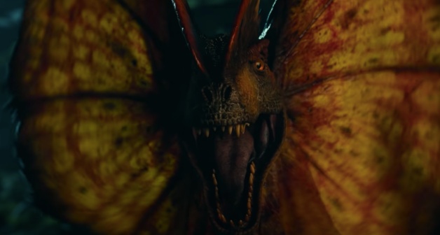 說到「雙冠龍」怎麼可以不提牠能夠展開頸部皮膜的特點,不僅在《侏羅紀公園》華麗開屏,在《侏羅紀世界》以電腦模擬出現,還嚇到真實的恐龍XD