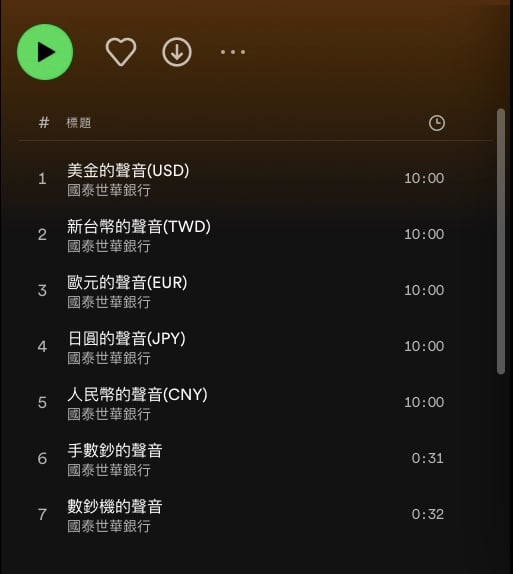 最近在社群上被大家轉發到不行的「Gold Noise」歌單,原來是國泰世華銀行官方在2月17日建立的「數鈔ASMR歌曲清單」(笑翻www好有創意)!歌單裡共有7首歌,歌名就直接叫做〈美金的聲音〉、〈新台幣的聲音〉、〈日圓的聲音〉、〈數鈔機的聲音〉等等……。(簡單暴力XDDD)